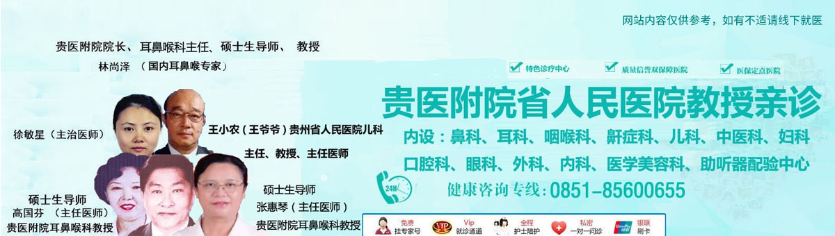 贵阳耳鼻喉医院是我国西南地区珍治耳鼻咽喉疾病的二级专科医院。开设有:鼻科、耳科、咽喉科、医学美容科、外科、妇科、内科、中医科、口腔科、眼科等专科。设有50张病床,由国内耳鼻咽喉专家,中华医学会耳鼻咽喉科学会贵州分会名誉主任,原贵阳医学院附属医院副院长兼耳鼻咽喉科主任林尚泽教授任院长,高国芬等多名贵阳医学院附属医院有三十年以上丰富临床经验的教授,副教授任各专科主任,擅长诊治耳鼻咽喉和头颈外科等各种疾病。 我院拥有目前国内外治疗耳鼻咽喉疾病的先进的医疗设备:德国第三代自动控制单针双低温射频消融手术系统、美国史赛克电视健康.. 了解更多>>